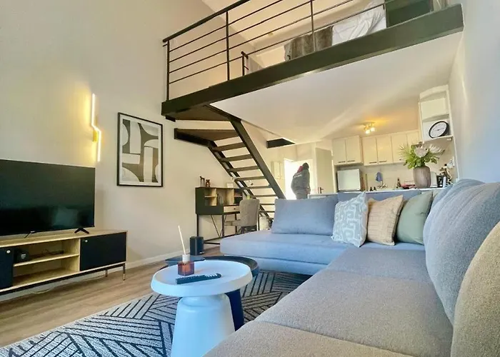 Este apartamento está equipado com 1 quartos, pátio, varanda e sofá, e cozinha com microondas, chaleira elétrica e refrigerador. O apartamento Charming, Sunny And Spacious Mezzanine Retreat também inclui terraço. Há 1 casas de banho com casa de banho separada e chuveiro.